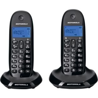 Motorola C1202 Twin Digital Cordless Phone - The Motorola C1202 digital cordless phone is an entry level telephone with a bright blue backlit display, phonebook with up to 50 names and numbers and a hands-free speakerphone.